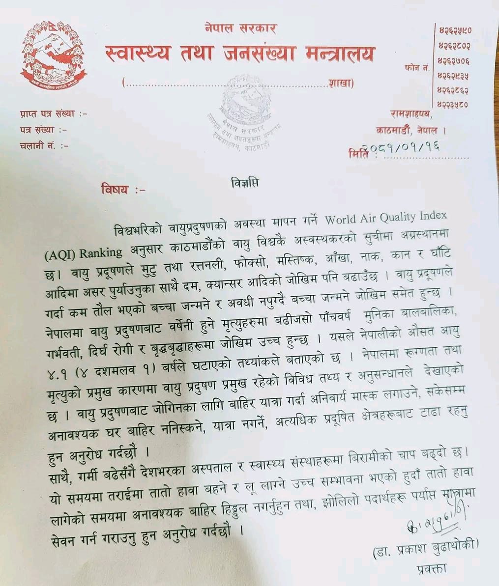 The Ministry of Health and Population has issued a warning amidst concerning levels of air pollution engulfing Kathmandu, urging citizens to prioritize their health by donning masks whenever stepping outdoors.