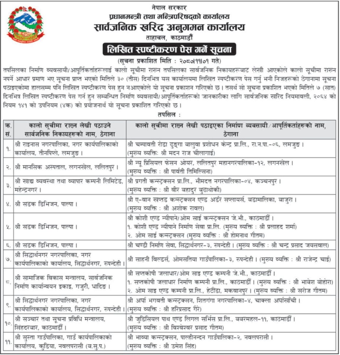 PPMO has issued notices against New Precious Fashion Wear, Pragati Construction Pvt. Ltd., A-one Khaptad Construction and Order Suppliers, and others.