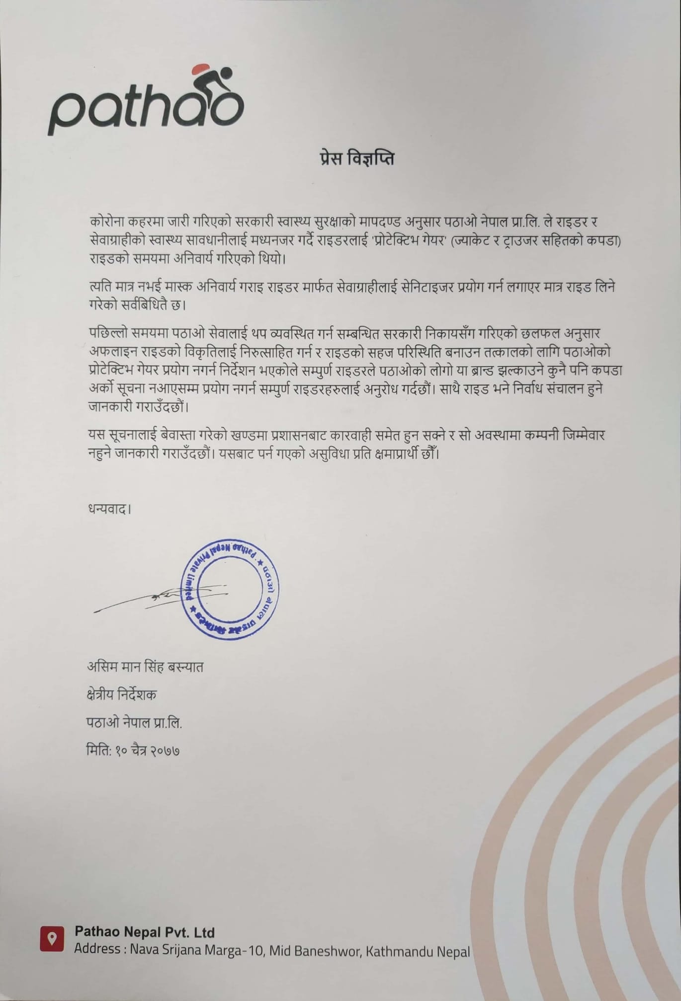 Issuing a statement issued on Tuesday, Asim Man Singh Basnyat, Regional Director of Pathao, said that as per the discussion held with the concerned agencies to manage their services, discourage offline rides, and create a comfortable environment for the ride sharing service, Pathao riders had been directed not to wear their uniform.